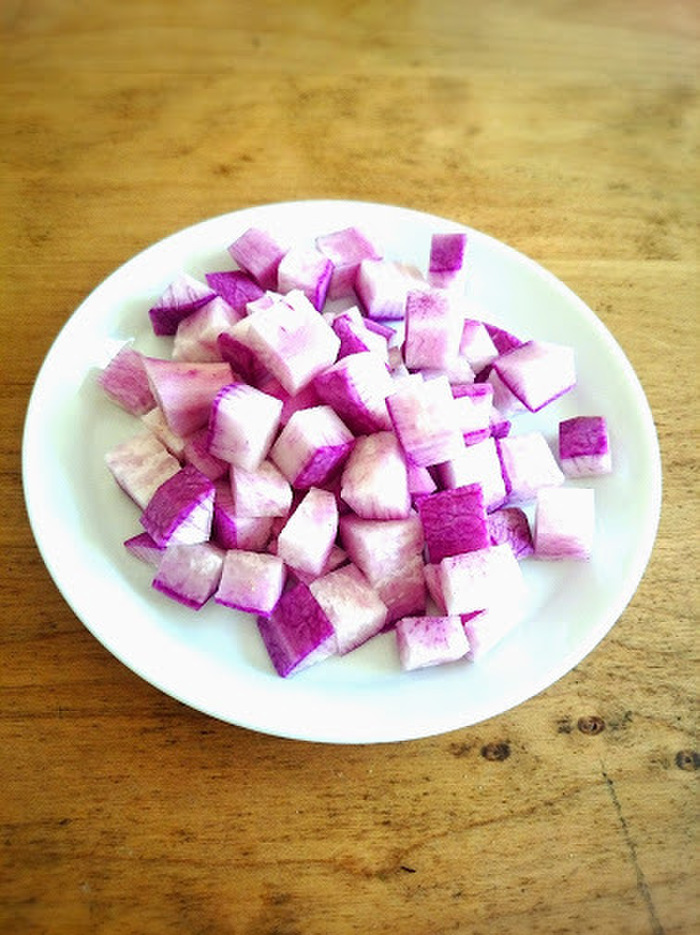 皮が薄紫色の大根をみかけたら、是非作ってみて下さい。子供もぱくぱく食べますよ~!!