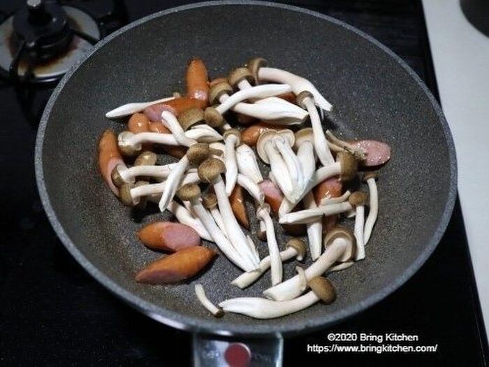 ウインナーに油が回ったら、しめじと塩を加えて炒める。