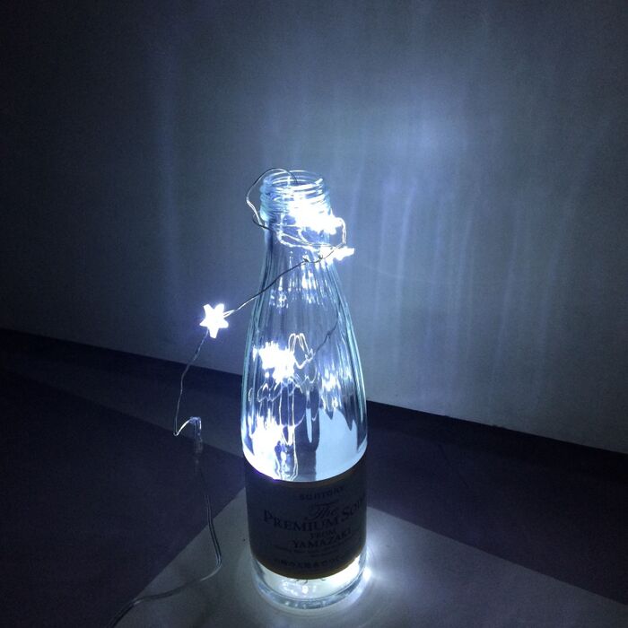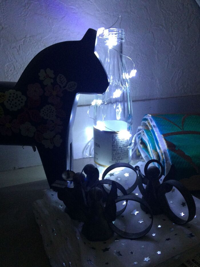 ガラスの瓶に、100円均一のストリングライトを入れて簡単に作る案。