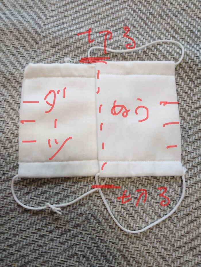 マスク二枚を重ねて縫うと、倍の大きさになります。