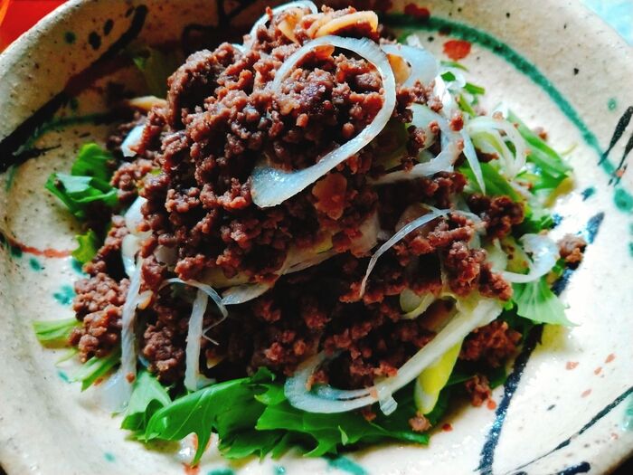 4.長ネギは斜め薄切りにして水にさらして水気を切りそぼろと混ぜ合わせて