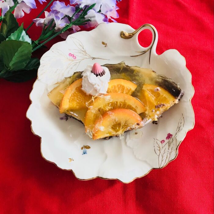 オレンジコンポートのシロップ150cc(目安です)にゼラチンを入れ煮溶かします。