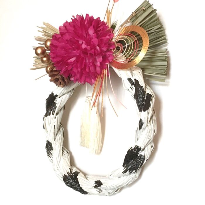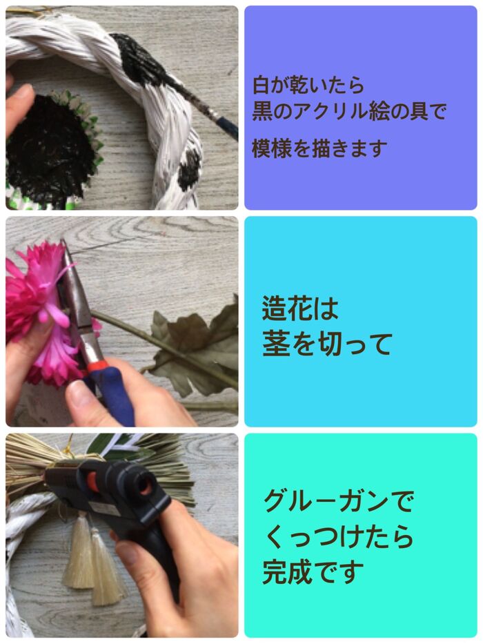 セリアのしめ縄飾りとアクリル絵の具、ダイソーの造花と家にあったご祝儀袋の飾りを使いました