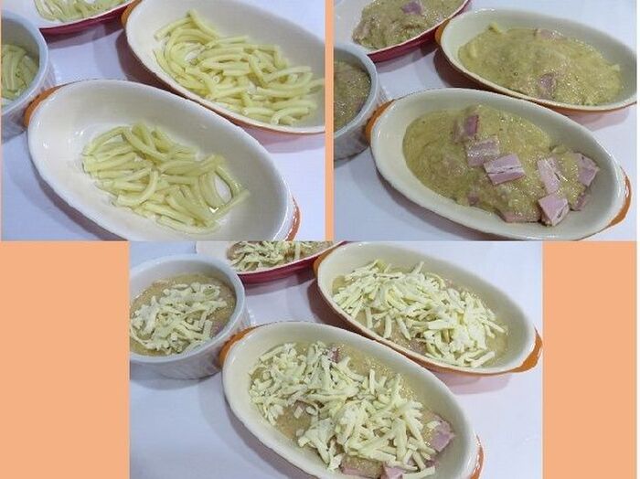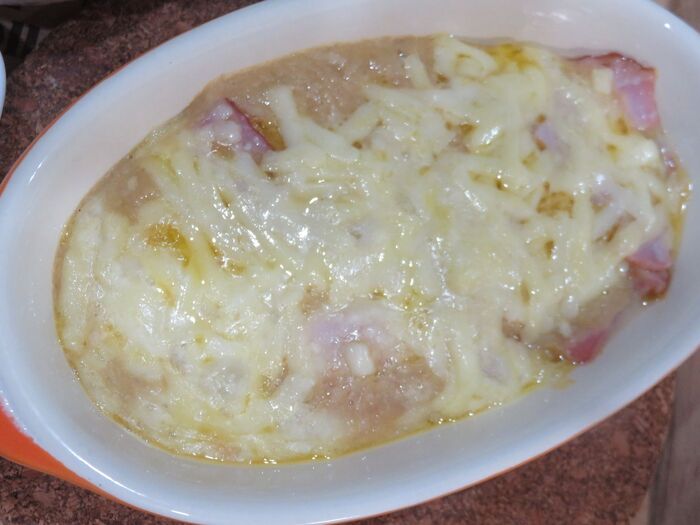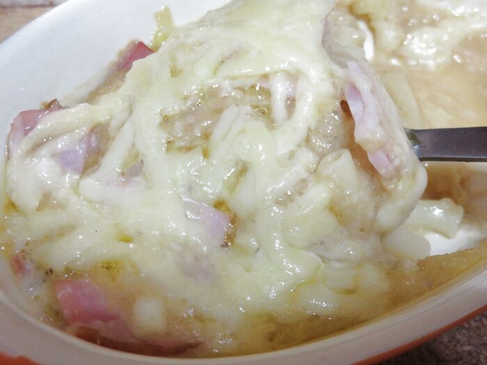 グラタン皿に、ゆでたマカロニ(お好みで)の上にボウルでませた材料をのせ