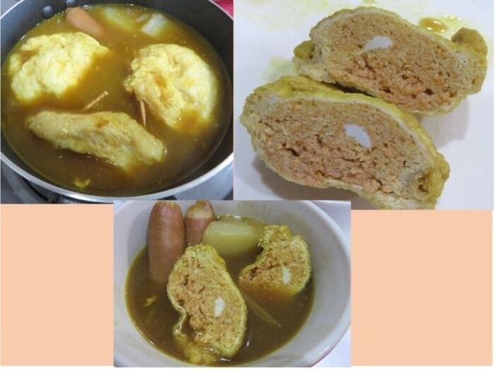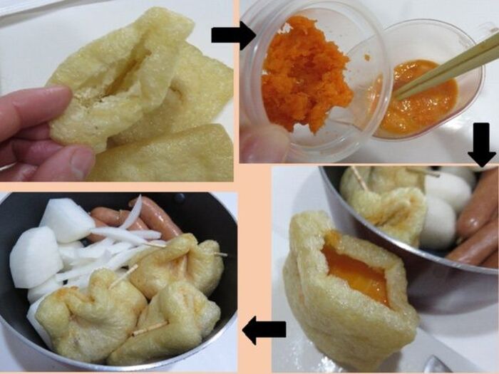 揚げの中に具材(溶き卵・すりおろし人参)を入れ、爪楊枝でとじる。