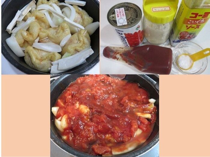 トマト缶1本、コンソメ・砂糖・ソース:各大さじ1