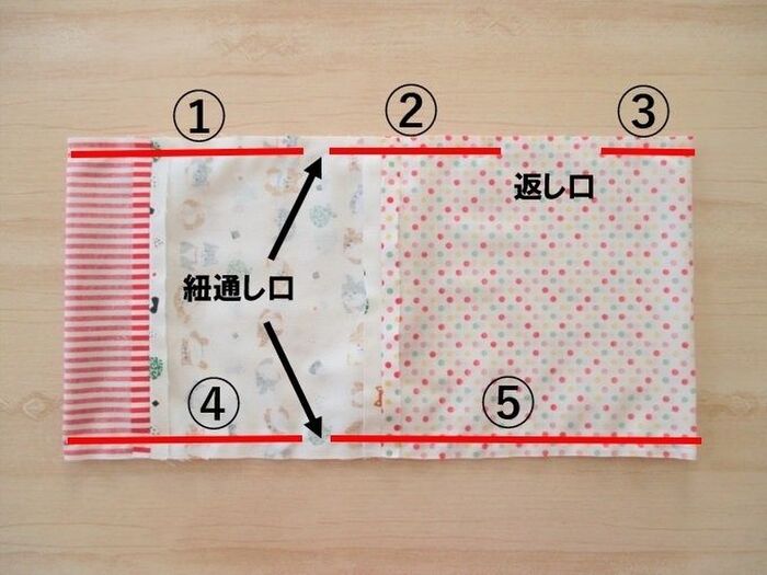 紐通し口・返し口を開けて縫い合わせます。