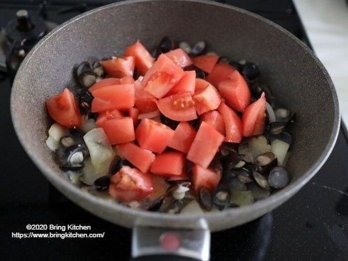 トマトとオレガノ、塩、黒胡椒を加えて全体が混ざるように炒める。
