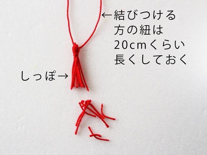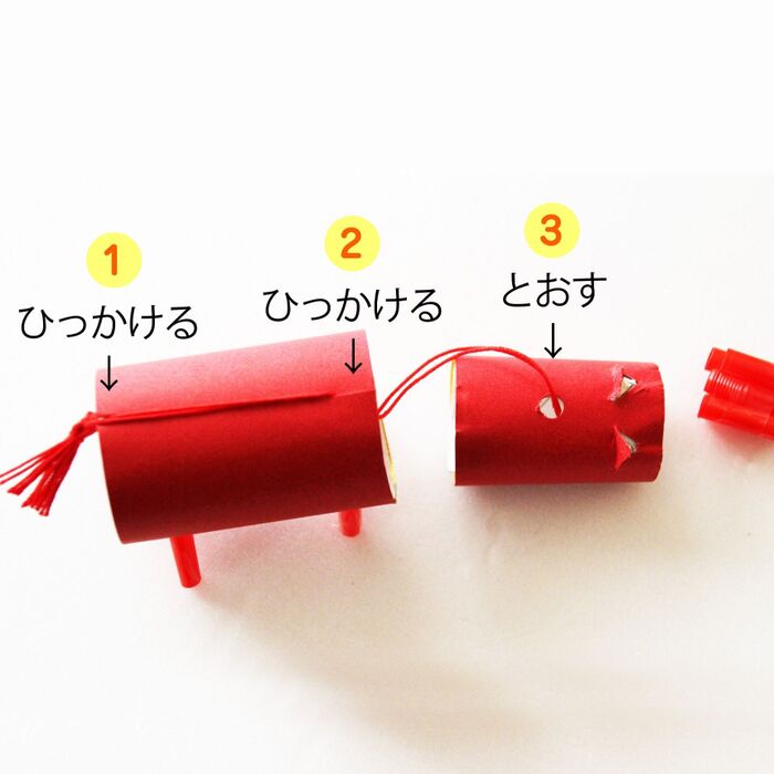 しっぽを1.2の順番に糸を引っかけ、3の穴に通す