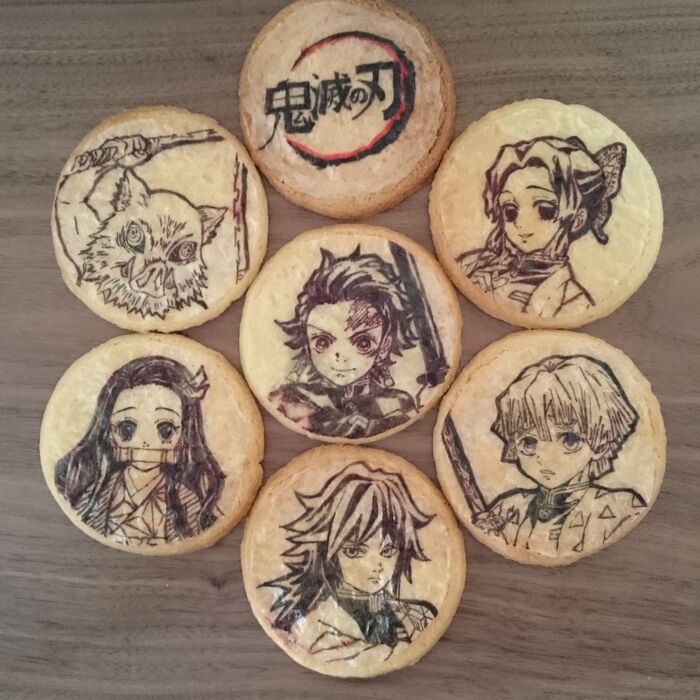 目玉焼きの型を使って丸く型抜きして、オブラートに絵をうつしたものを貼って、焼きました。