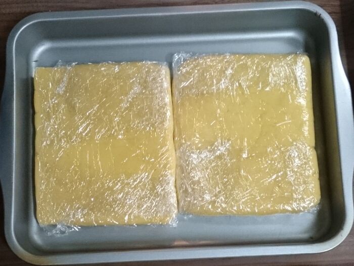 パットにのせて、冷蔵庫で2時間以上寝かせます。