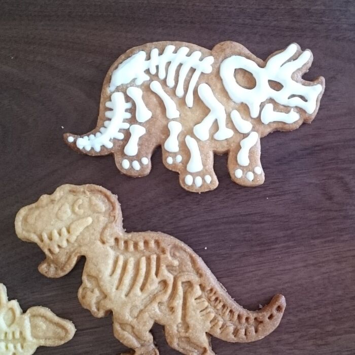 恐竜の型抜きを使い、焼いた後、白いアイシングで骨の部分をうめて化石風に☆