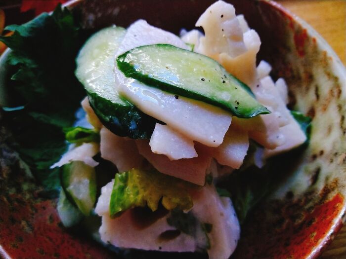 4.ボウルにれんこん、セロリ、葉、きゅうり、マヨネーズ、オリーブオイルを入れてよく混ぜ合わせる