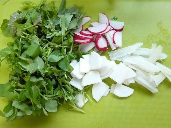 七草はさっと洗い、すずな、すずしろは皮付きのまま半月切りにします。根がついているものは切り落とし3㎝位に切ります。