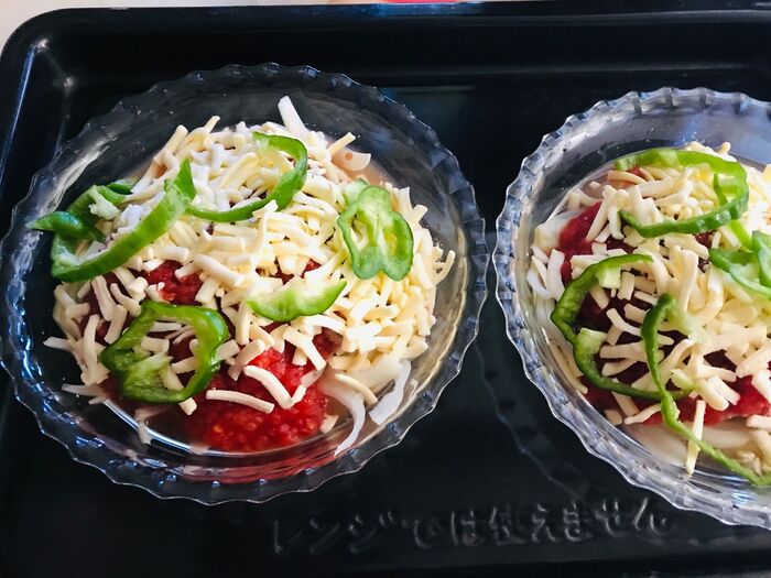 ③耐熱用の深みのあるお皿に①、トマト缶、サバ缶をのせ