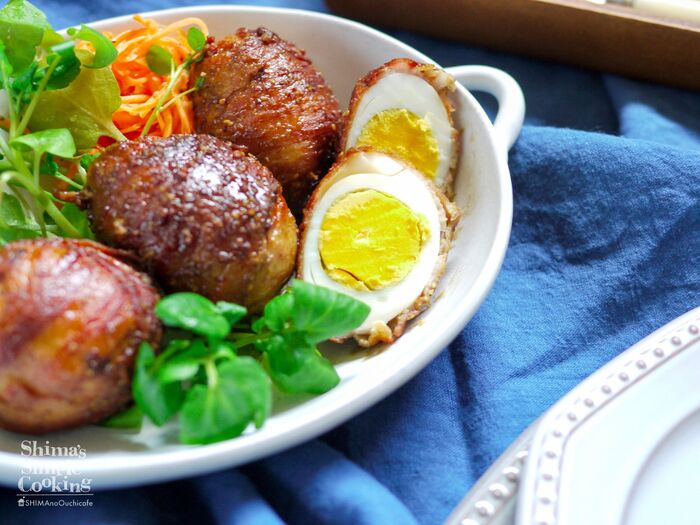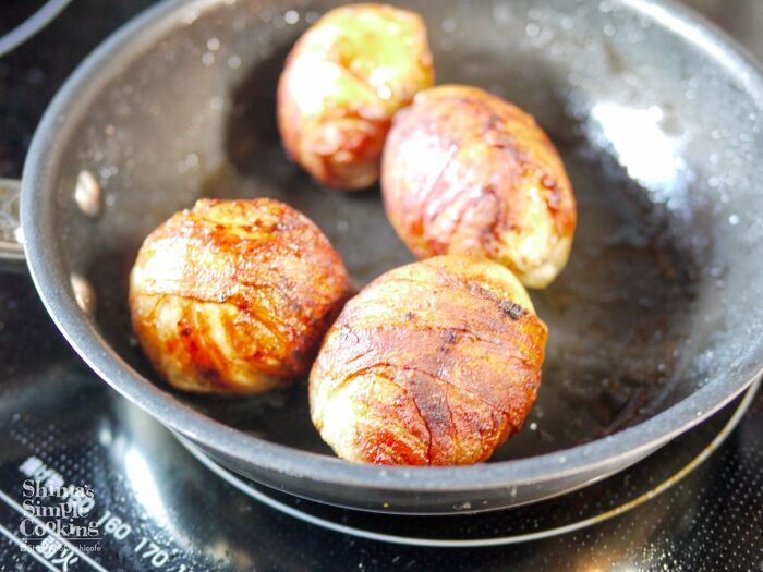 1、ゆで卵に豚バラ肉を巻きつけます。