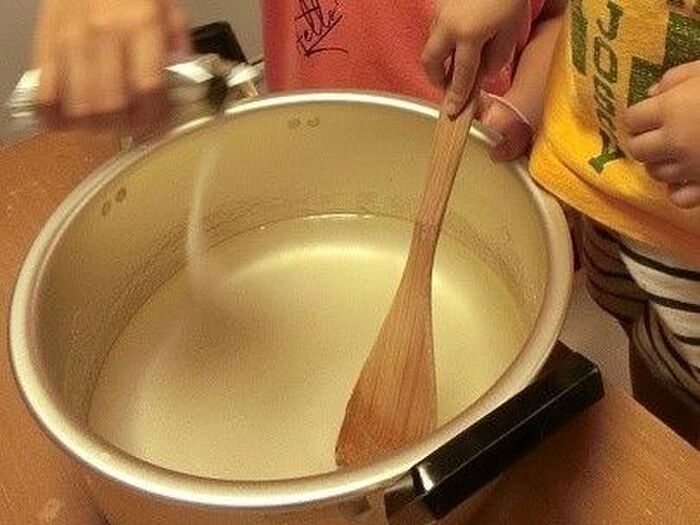 水を50℃くらいに沸かし、1500ccのうち1350ccを鍋に入れます。こんにゃくの精粉を少しずつ入れて混ぜます。