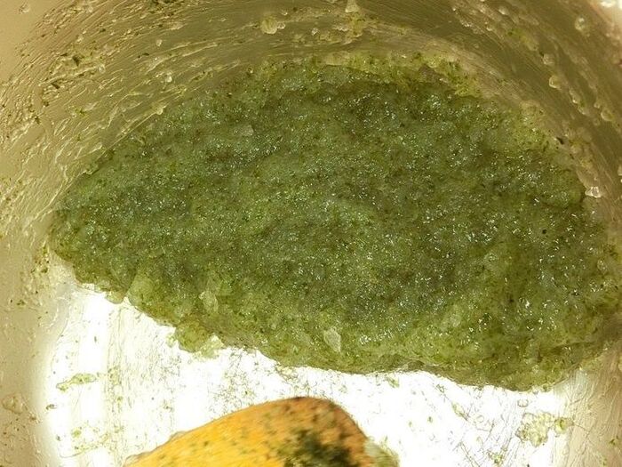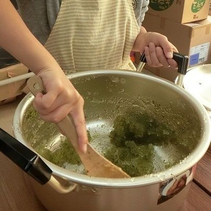 こんにゃくをねりながらアクを入れ、全体が混ざるようにまんべんなく混ぜ合わせます。このまま形を整え20分くらいおきます。
