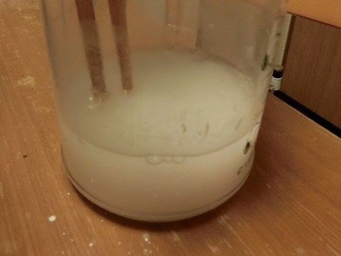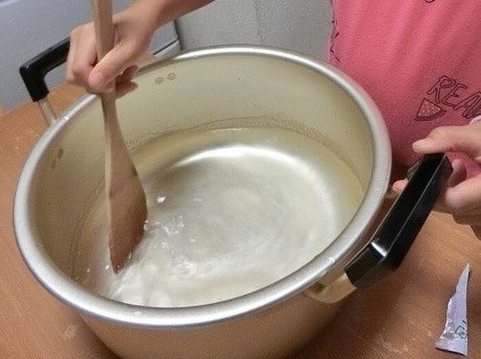 取り分けて置いたお湯150ccに凝固剤2gを入れてよく混ぜ合わせ、アクを作ります。