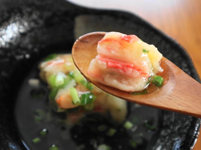 ⑦ラップを外して器に盛り付け、白だし餡をかけて細ネギを散らす。