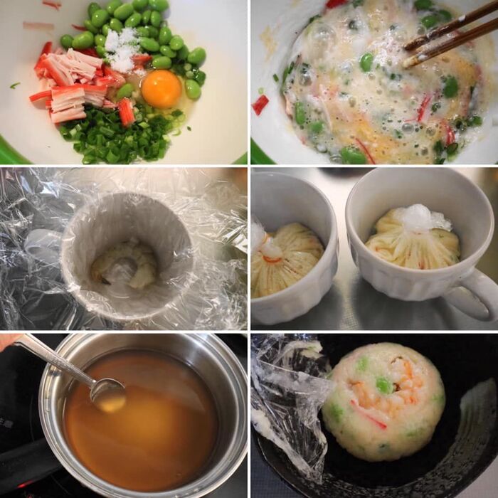 ②細ねぎは小口切り、飾り用に少量取りおく。カニカマは3つに切ってほぐす。枝豆は殻から外す。