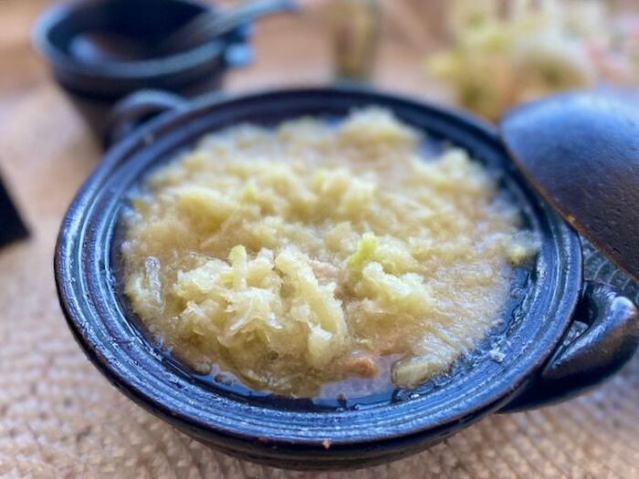 白菜と豚バラ肉に火が通ったら 薄口醤油を加え味を見て足りなければ塩を加え、軽く水気を切った大根おろしを入れ5分ぐらい煮る
