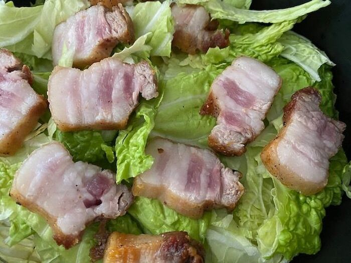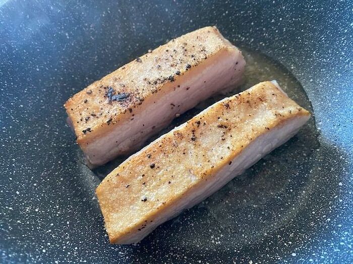 豚バラ肉は塩・コショウをしっかりすり込み 米油で 全体にこんがりと焼き色をつける