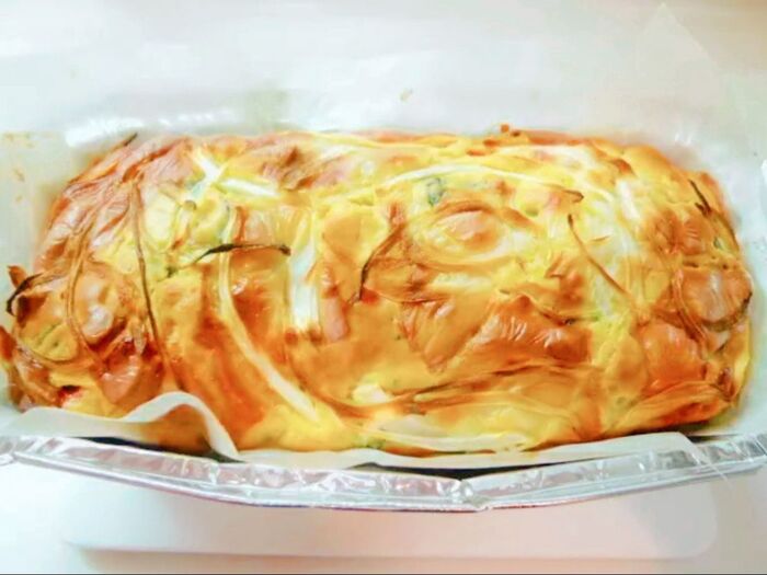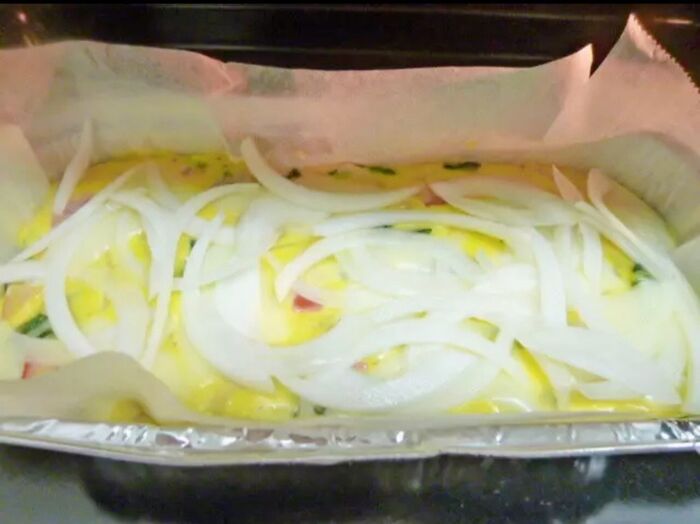 クッキングシートを敷いたパウンド型に流し入れたらトントンと空気抜きをし、表面にちぎったチーズと取り分けておいた玉ねぎをのせ