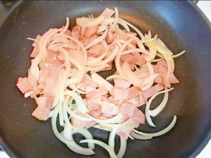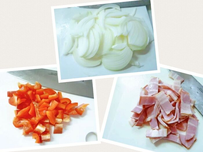 パプリカはさいの目切りにし、ベーコンは適当な幅に切る。