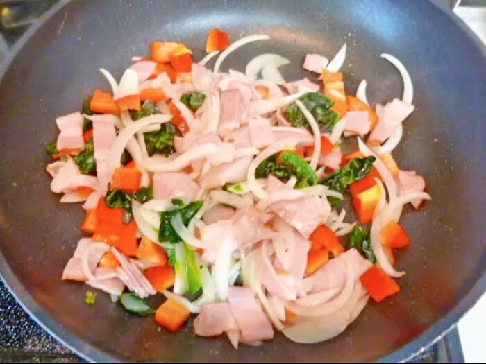 玉ねぎが透き通ったらパプリカとほうれん草を加え、ハーブソルトで下味をつける。