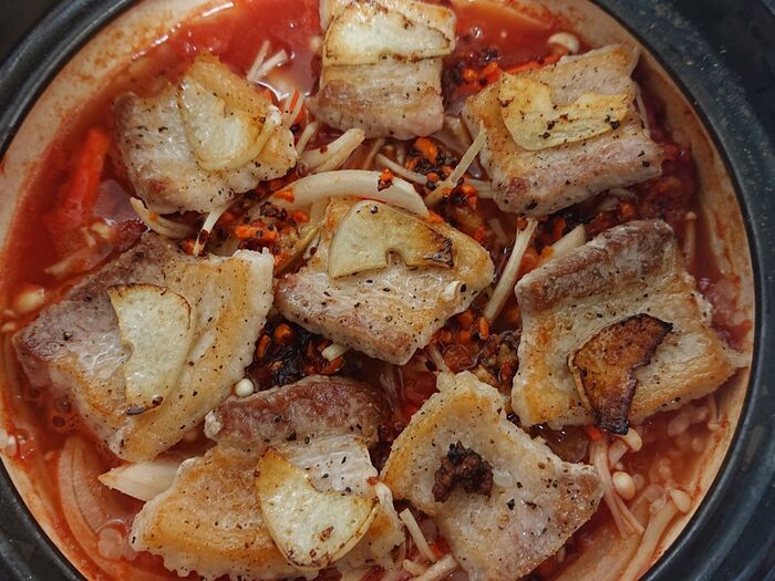 米、野菜、豚バラ、ニンニク、食べるラー油・・・・・