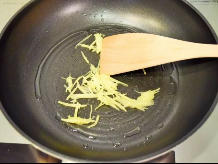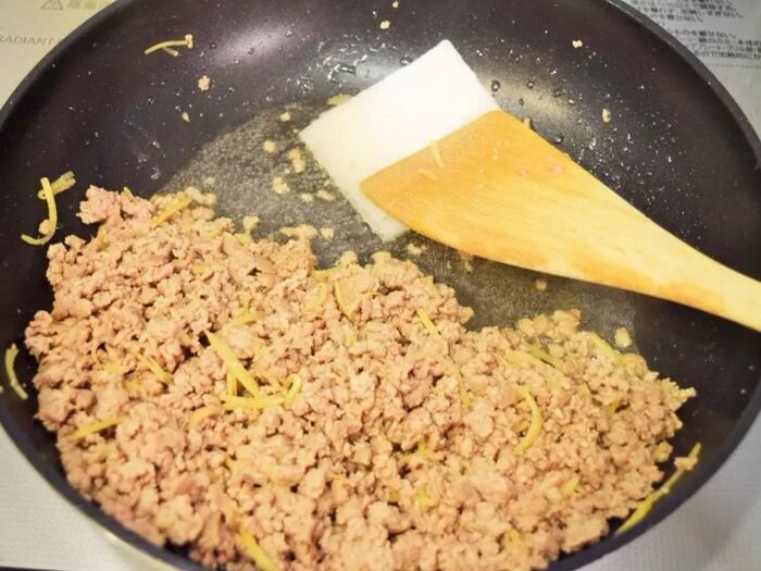 ひき肉を炒め、脂が多く出るようだったらペーパーで軽くとる
