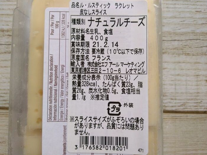 コストコのル・ルスティックのラクレットの気になるカロリーですが、パッケージ背面のラベルにしっかりと書かれていました。