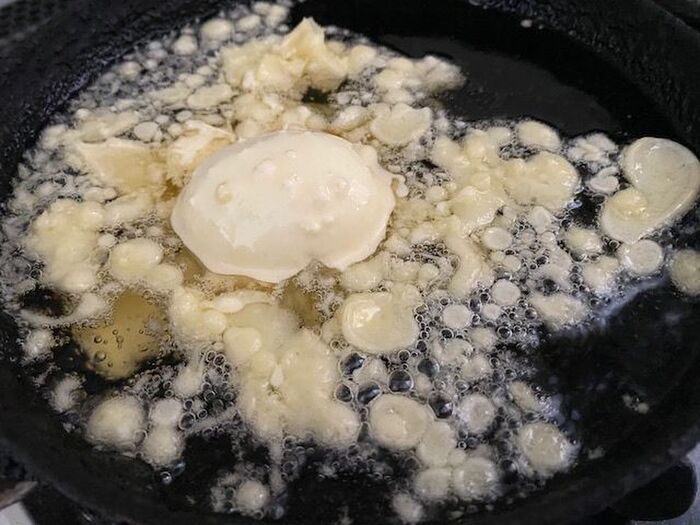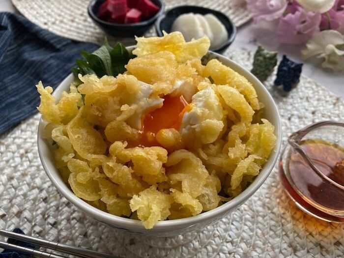 高温の揚げオイルで 天ぷら衣を周りにたらして 天かすを