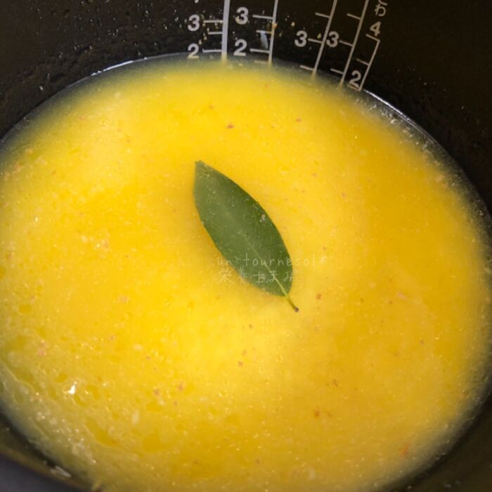 炊けたらローリエを取り出し、牡蠣とバターを入れて10分蒸らし、全体をよく混ぜ合わせたら完成‼︎