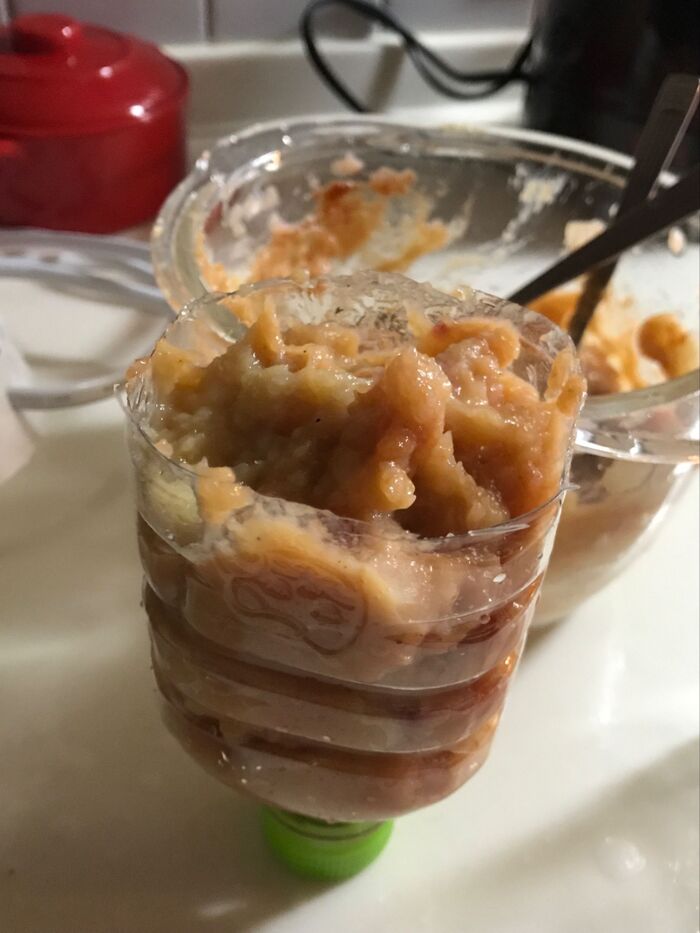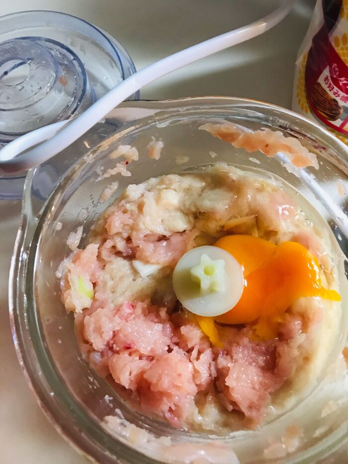 人参、玉ねぎ、ジャガイモは、鶏胸肉は大まかに切り、フードプロセッサーでミンチにします。