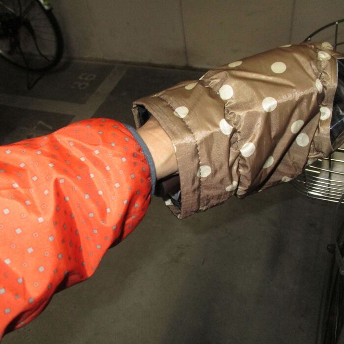 肘まで入り暖かいけど、見た目が悪いしせっかく買ったハンドルカバーも使いたかったので