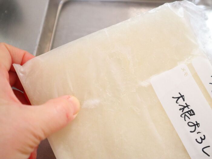 大根おろしは水分が多ければ多いほど、冷凍した時にカチンコチンに硬く凍ります。感触としては氷。全部を一気に使う場合は袋のまま解凍すればいいのですが、少量だけ解凍したい場合は折って取り出します。