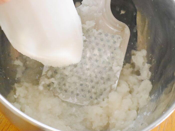 すりおろした大根は、かなりの水分が出ます。水分を切ったほうが冷凍しやすいのですが、この水分にも旨みと栄養がたくさん含まれているので、軽く切る程度にするのがおすすめ。私が冷凍するときには、水分を切らず全部一緒に冷凍しています。冷凍するときは、この水分が入っていてもこぼれないような容器に入れるのが必須。
