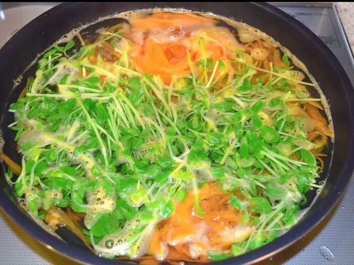 たっぷりのお湯を沸騰させたら、人参と豆苗を同時に入れ30秒程度さっと茹で