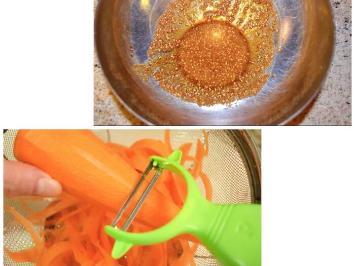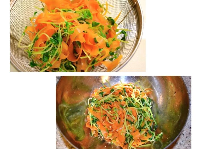 人参はピーラーで縦にスライスし、豆苗は根と切り離したらさっと水洗いし水けを良く切っておく。