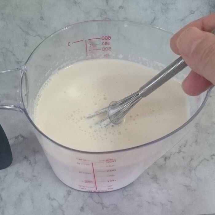 豆乳生クリーム、豆乳、砂糖を入れてまぜる。