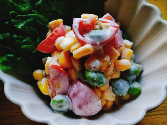 5.ボウルに枝豆、コーン、ミニトマト、マヨネーズを加えてよく混ぜる