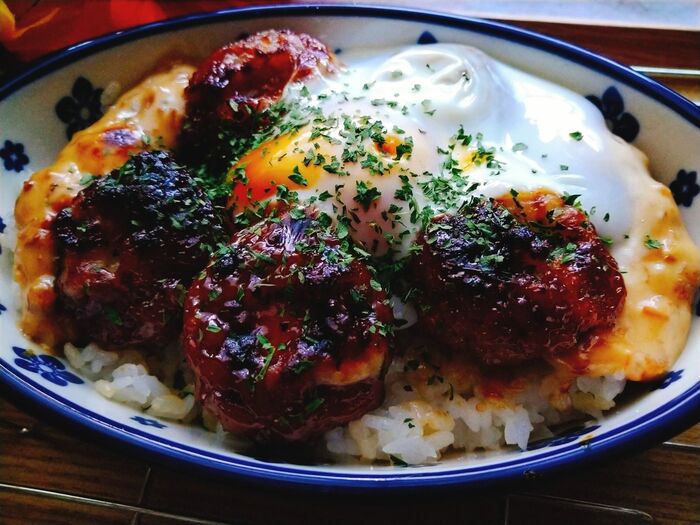 3.牛カルビマヨネーズをのせて、中央に卵を割り落とす