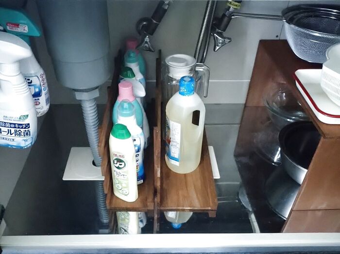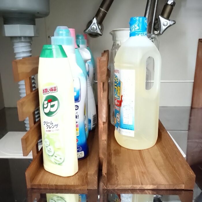 (左9cm幅)台所洗剤等、手前に使用中を、奥側にストックを収納