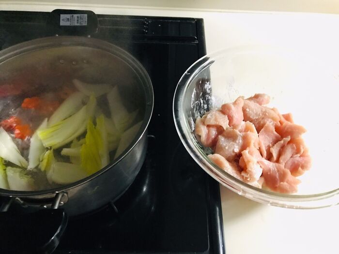 ①鶏胸肉はそぎきりにして生姜をまぶし、片栗粉をまぶします。