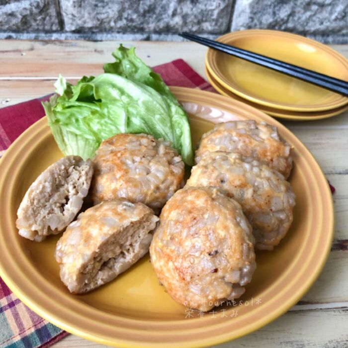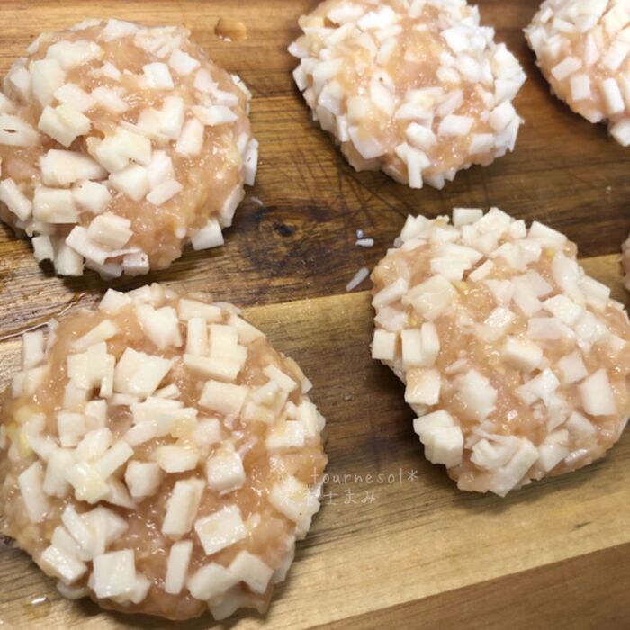 れんこんと片栗粉をよく混ぜ合わせ、②を小判型に成形してれんこんをつける。