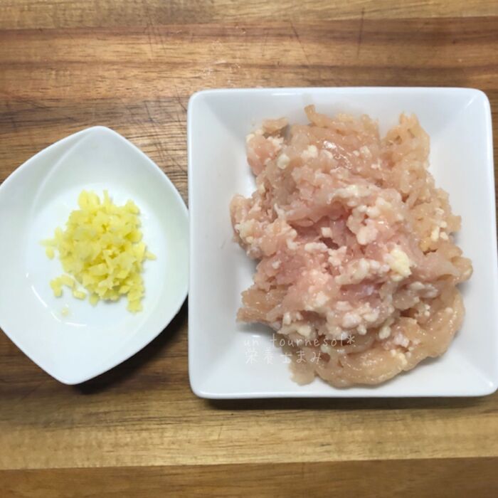 鶏ミンチとしょうが・卵・酒・しょうゆ・塩・胡椒をよく混ぜ合わせる。
