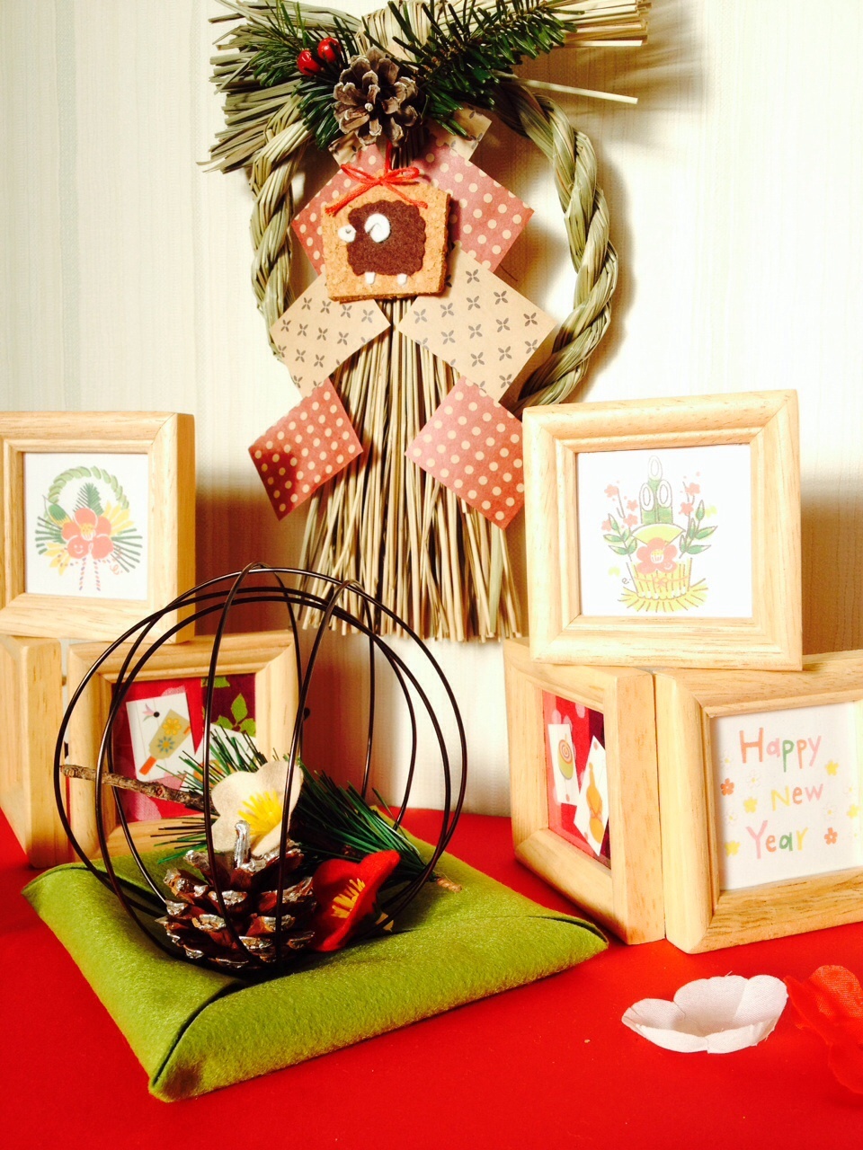 厚みのあるフレームなので積み重ねてディスプレイ出来ます。リメイクしたしめ飾りや、手作りのワイヤーを使った正月飾りと合わせると華やかなお正月コーナーになりました。