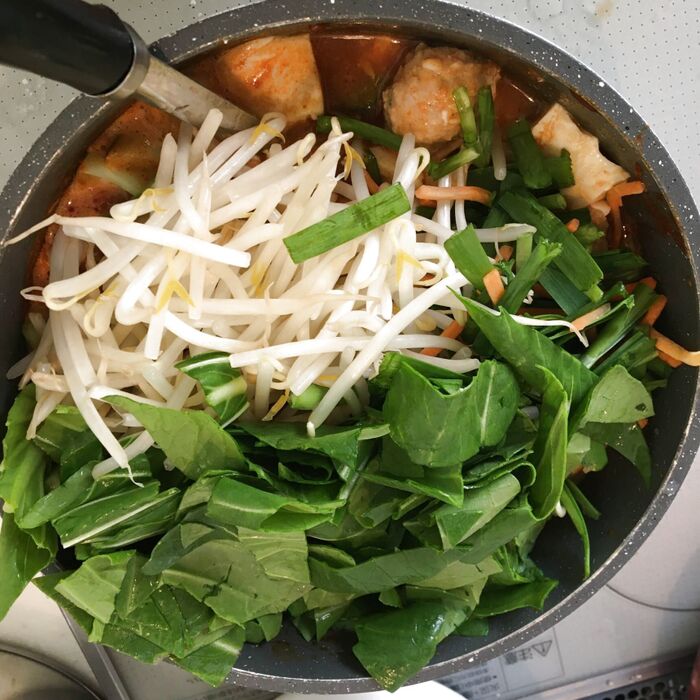青梗菜、カット野菜(もやし、にら、ニンジン)を追加して